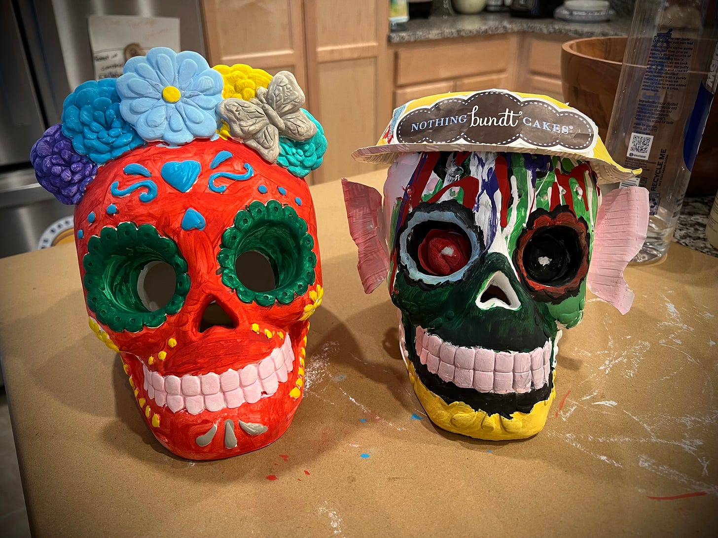 We’ve tried to blend—hasn’t gone amazing. First I came over to paint sugar skulls for Dia de los Muertos. Everyone—aunties, cousins, girlfriend, girlfriend’s daughter, me—painting sugar skulls. The paint on my sugar skull was expressionistic. I didn’t know where I was going having zero paint-a-sugar-skull priors. I had bottle caps for eyes. There was a paper plate hat. When all the sugar skulls were finished, my girlfriend’s daughter was asked what she thought of mine. You don’t know hope’s opposite until a black-eyed eleven year old tells your future familia she wants to destroy your art.
